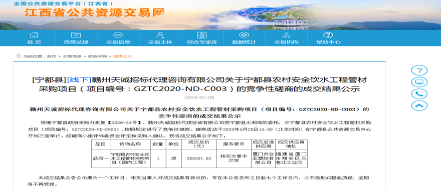 2020年5月,我司參加寧都縣財(cái)政局政府采購(gòu)辦公室下達(dá)的寧采招(2020)20號(hào)計(jì)劃-寧都縣水利局的寧都縣農(nóng)村安全飲水工程管材采購(gòu)項(xiàng)目進(jìn)行競(jìng)爭(zhēng)性磋商。 經(jīng)磋商小組評(píng)標(biāo)委員會(huì)評(píng)定和采購(gòu)人確認(rèn),我司廈門(mén)市臺(tái)亞塑膠有限…